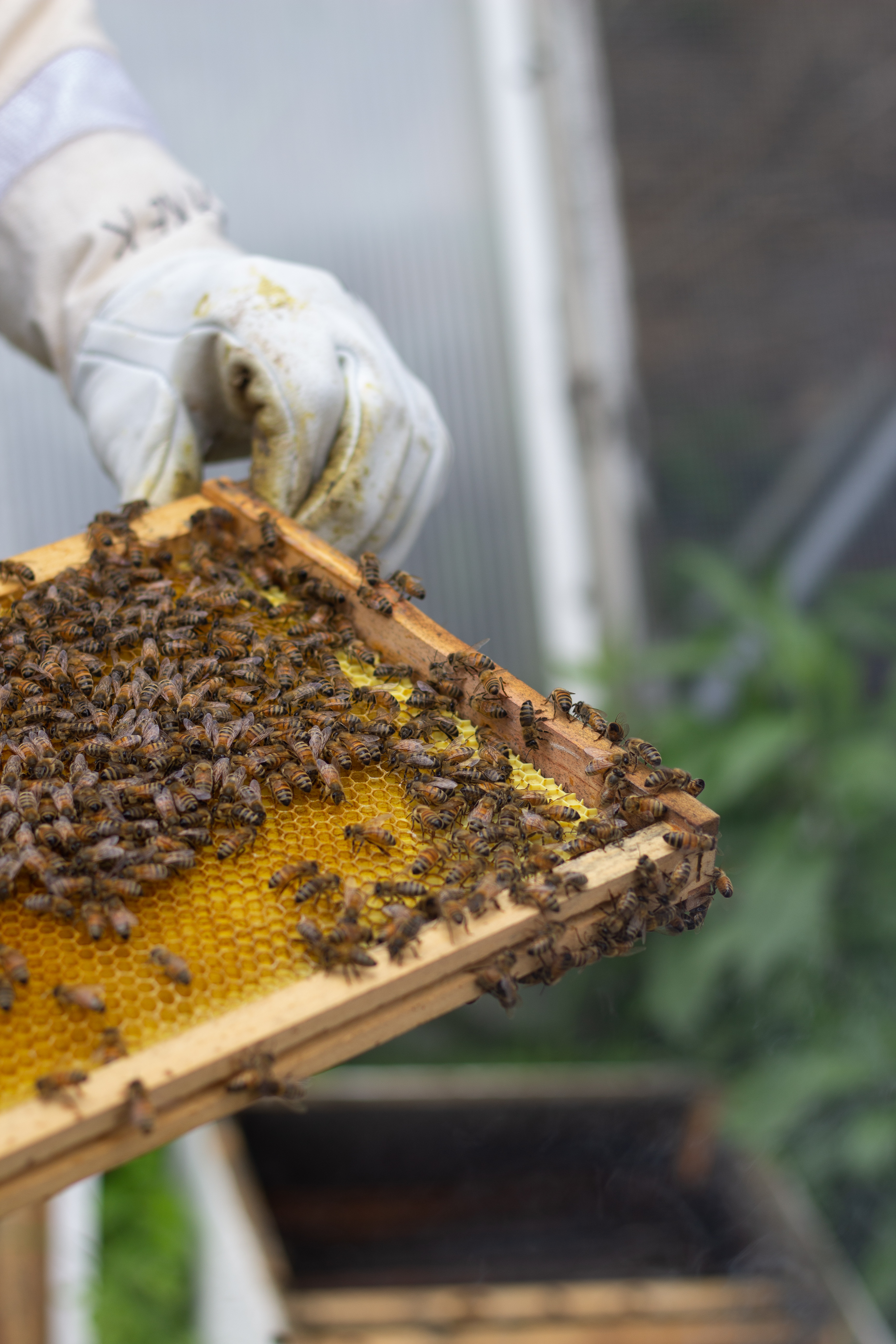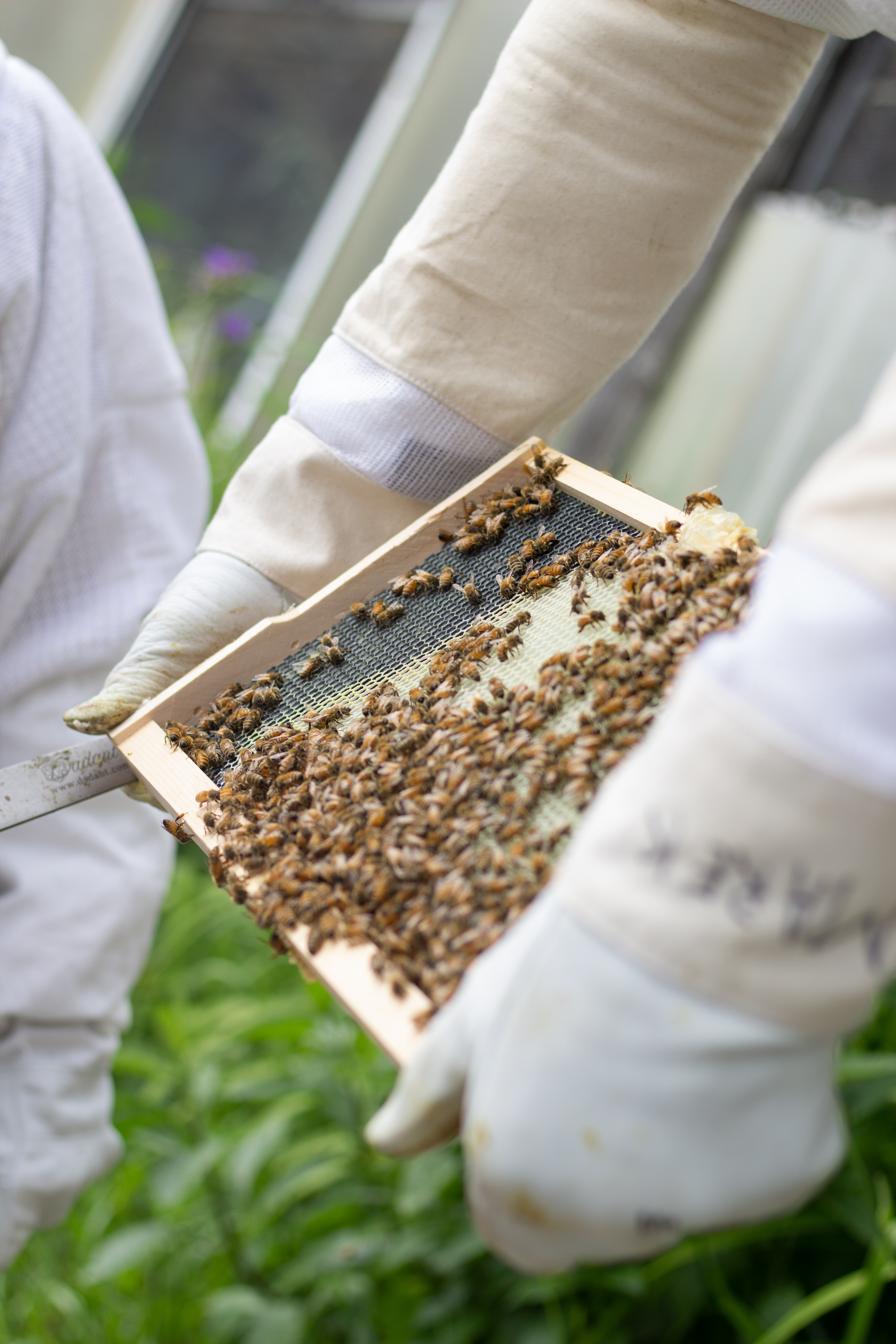 Local gardeners of Kumunda Community Garden, neighborhood residents of Woodlawn and local beekeeping enthusiasts joined Phoenix Farm’s weekly hive inspection on the grounds of First Presbyterian Church. Beekeeper Marek points out signs of healthy honey production and population control. Participants wore full beekeeping suits as they smoked out the beest and managed the excess drone larvae population, wihch is detrimental for the hive as they prepare for the colder months.